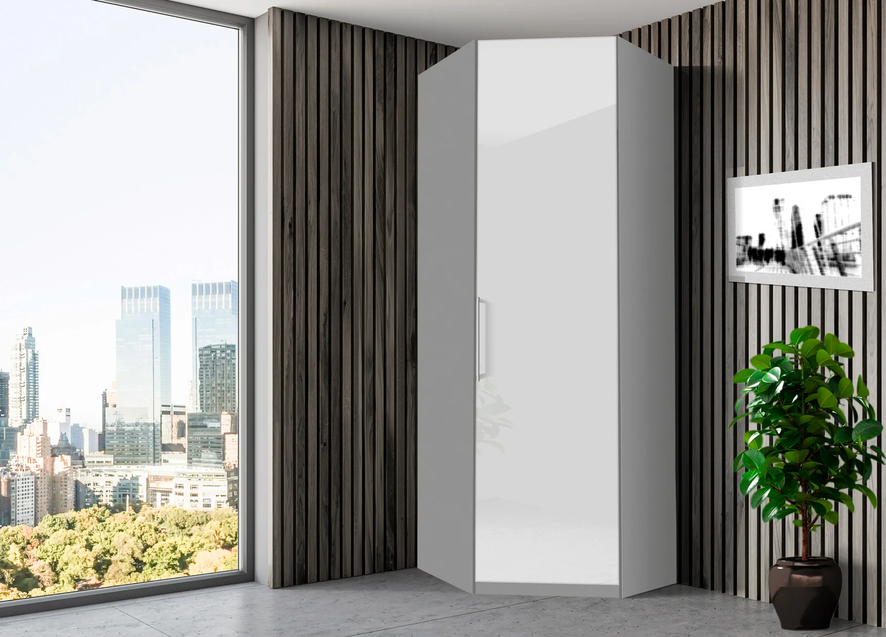 The Berlin Corner Wardrobe is a smart solution for rooms where every inch counts. Designed to fit neatly into a corner, it transforms unused space into practical storage without overwhelming the room. Behind its smooth-opening hinged door, you’ll find a well-organised interior with a hanging rail and an adjustable shelf—ideal for clothing, accessories, and everyday items. Available in a range of modern finishes including wood effects and glass, it adapts easily to both classic and contemporary interiors. You can also add mirrored panels to brighten the room and create a more open feel.