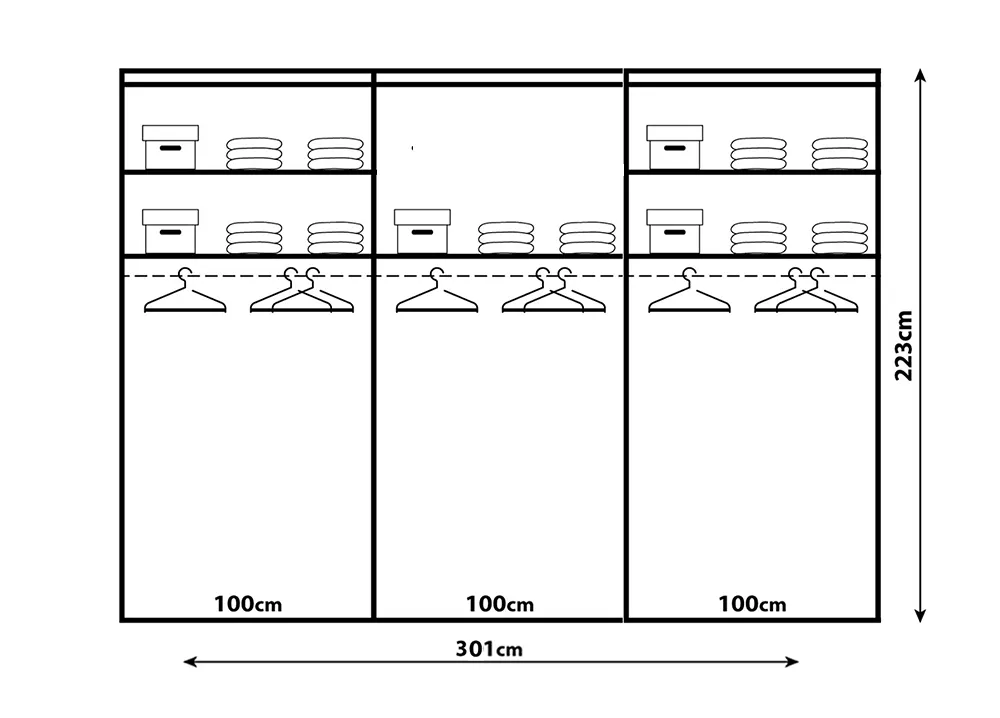 Offering maximum storage with a streamlined appearance, the Rauch Purisma 301cm wardrobe with exterior drawers is designed for larger bedrooms and shared spaces. With six hinged doors, four outer drawers, and three equal 100cm compartments, it delivers a clear, structured interior layout.