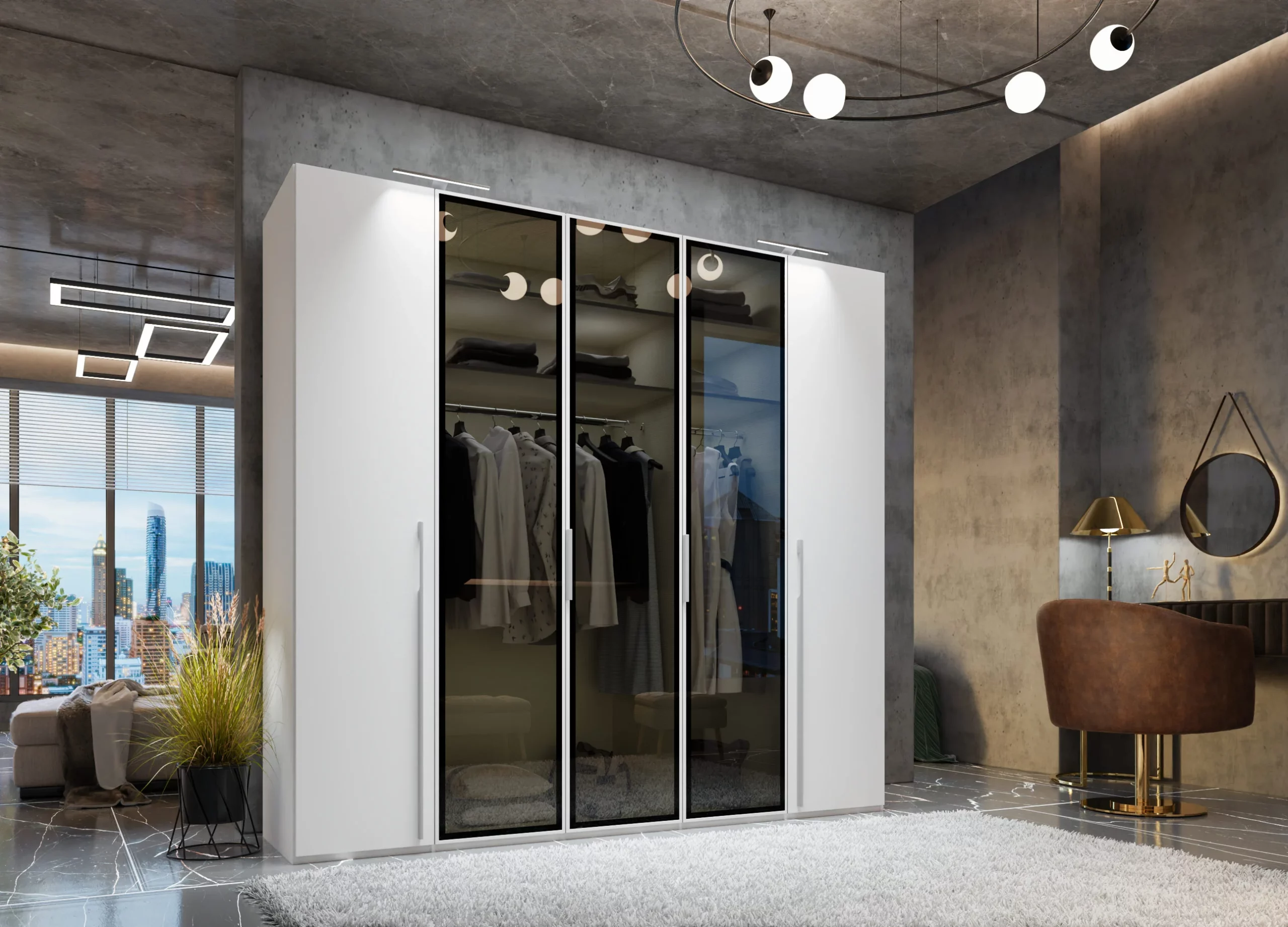 The Rauch Skat Shine 251cm wardrobe offers generous storage wrapped in a sleek, contemporary design. Featuring five hinged doors, it showcases three transparent grey glass doors at the centre, framed by solid carcass panels in white, silk grey, or graphite. Internally, the wardrobe is divided into four practical sections (50cm, 100cm, 50cm, and 50cm), providing ample space for hanging garments, folded items, and accessories. Designed with durability in mind, this wardrobe combines premium materials with thoughtful detailing, making it a reliable and stylish addition to larger spaces.