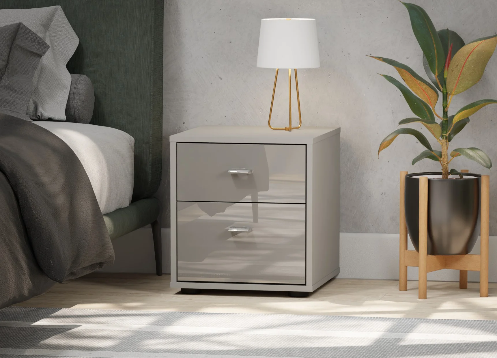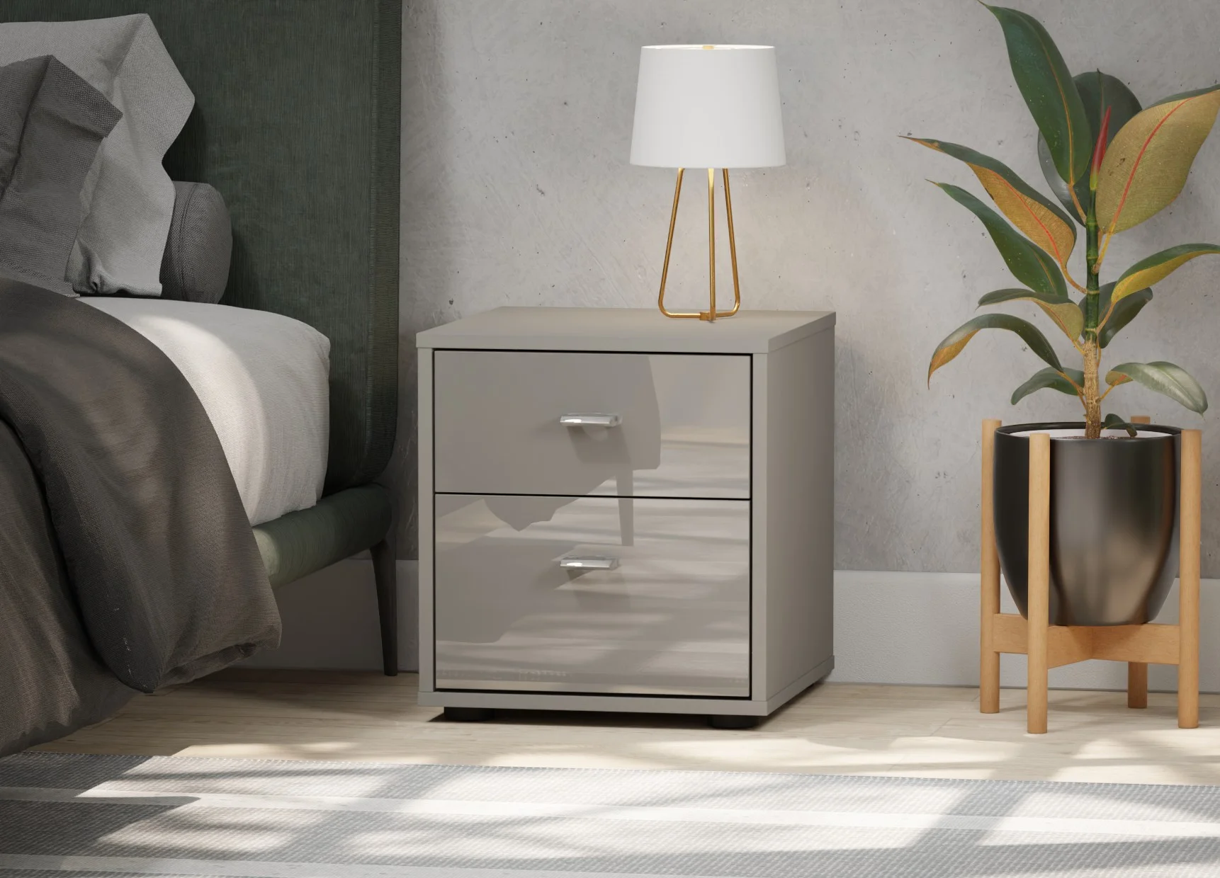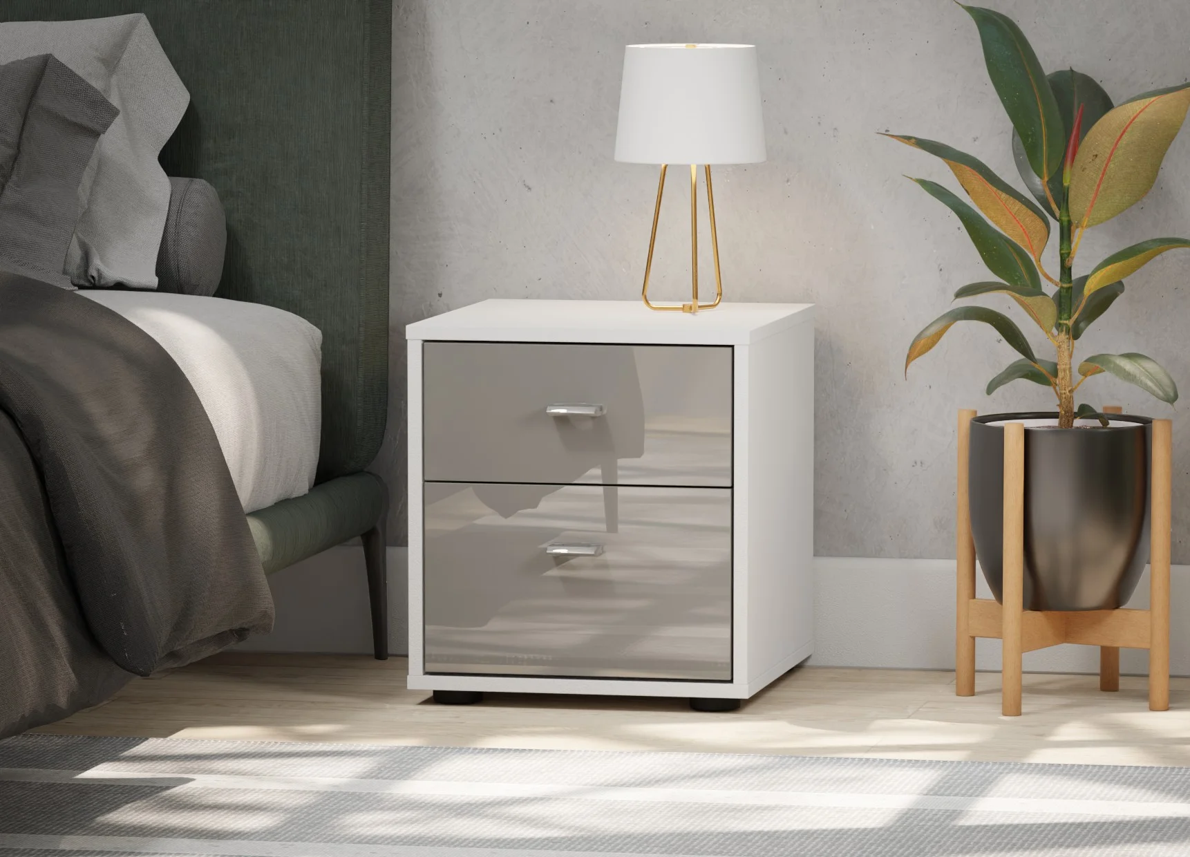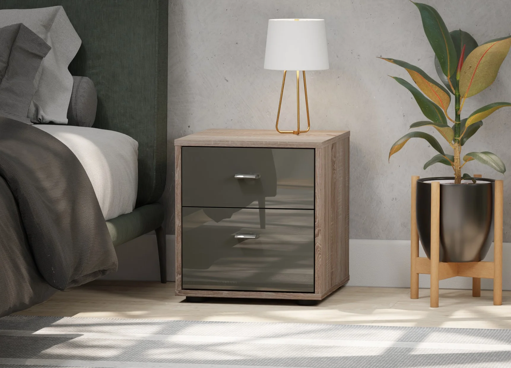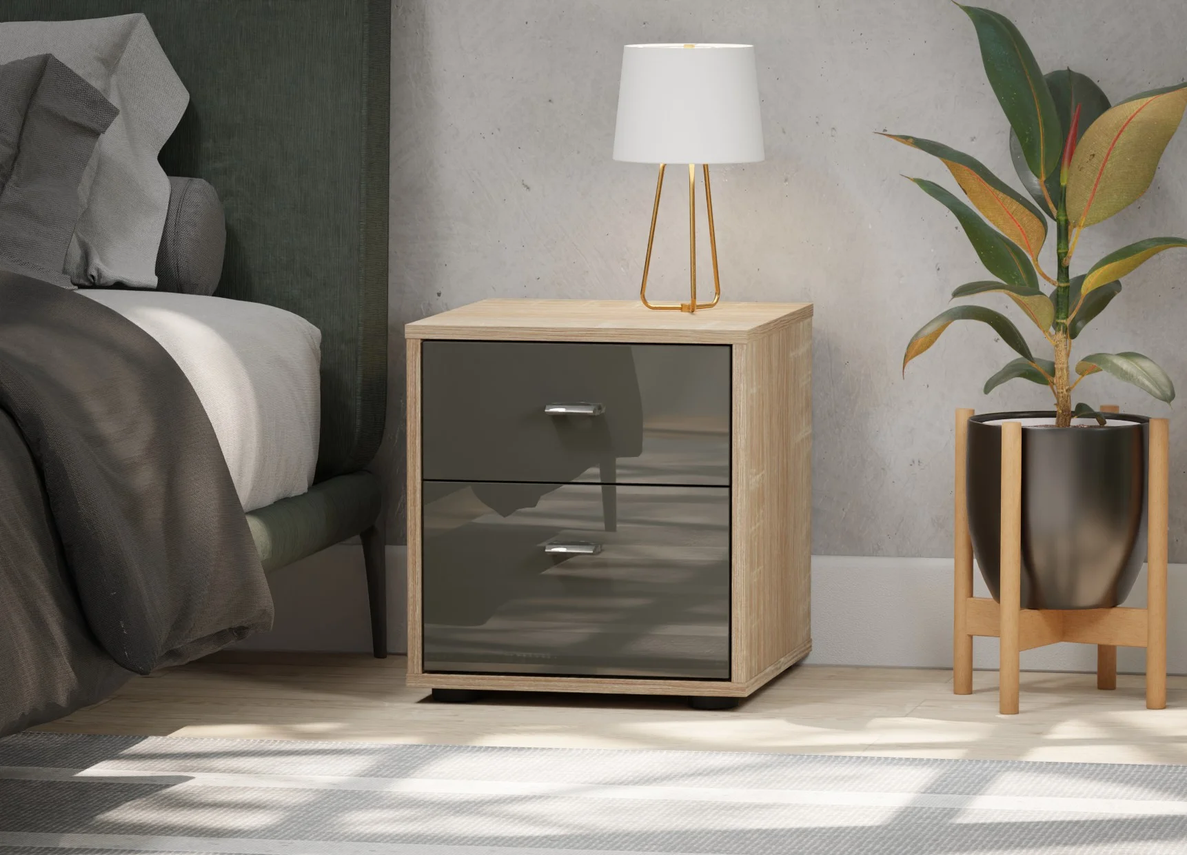 The Wiemann Tokio bedside table is a compact yet versatile storage piece designed to sit beautifully alongside modern wardrobes and beds. With its clean lines and two smooth-gliding drawers, it offers practical space for night-time essentials while keeping your bedroom calm and uncluttered. Part of Wiemann’s VIP collection, it features the brand’s signature silver-grey striped interior and is available in a wide choice of finishes, from light tones like white and champagne to deeper shades such as graphite and rustic oak. You can also choose matching matt fronts or refined glass options, along with silver, chrome, or slate handles to tailor the look to your space.