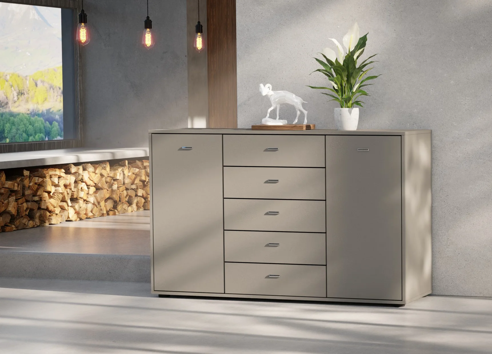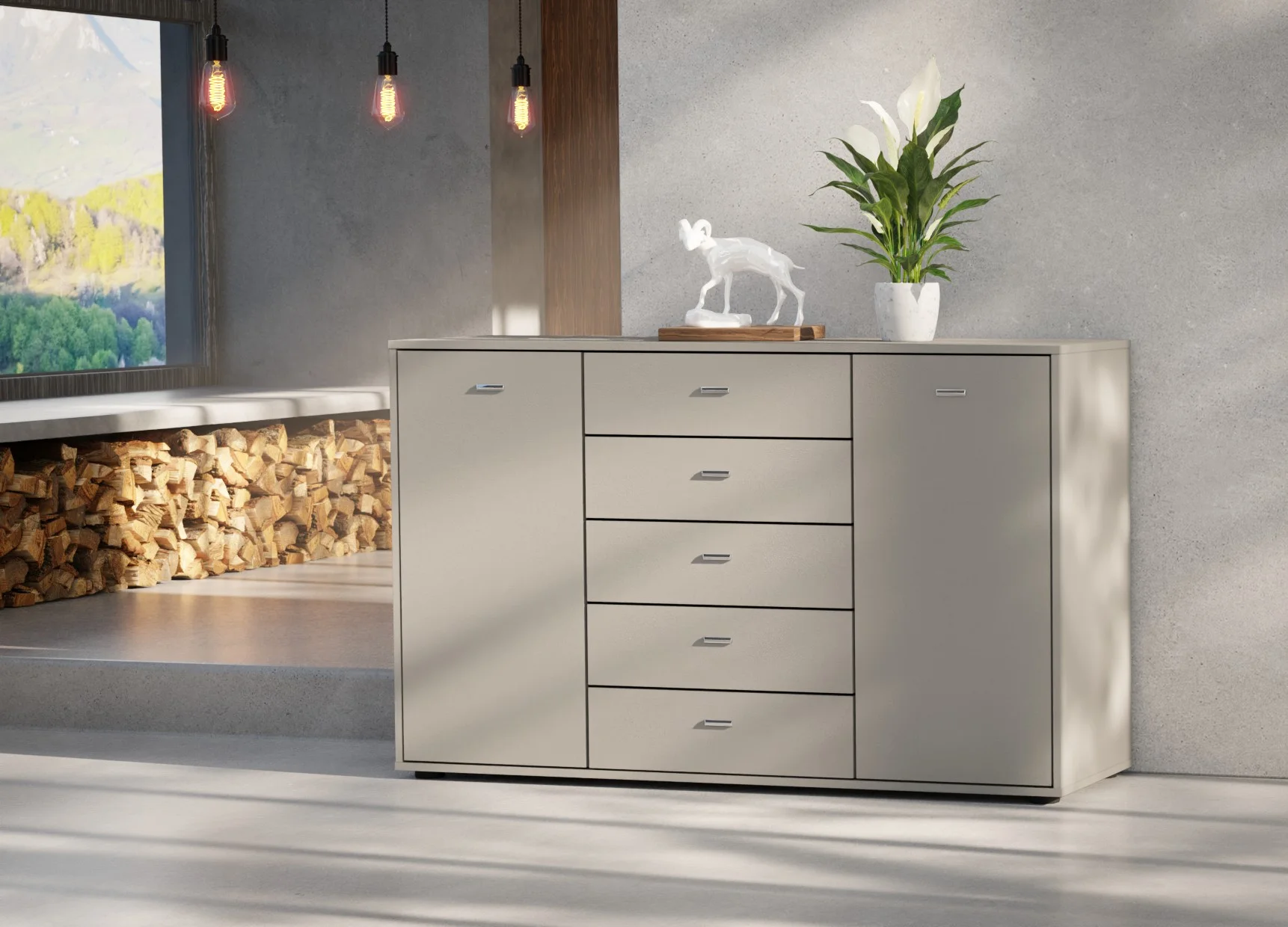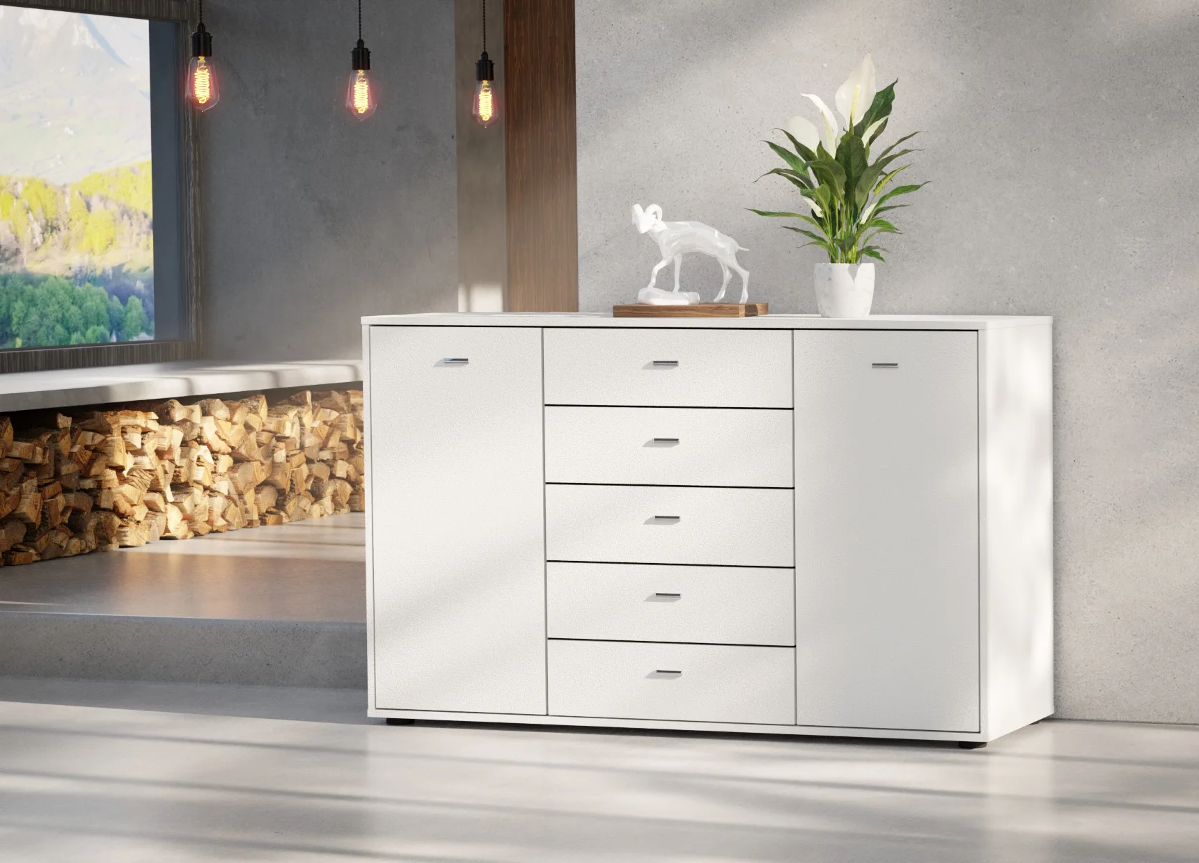 The Wiemann Tokio 5 Drawer 2 Door Chest is designed for those who want generous storage with a more versatile layout. With two hinged cupboards positioned on each side (with 1 shelf behind each) and five drawers neatly arranged in the centre, it offers a practical mix of concealed and easy-access storage within a wide, balanced design.